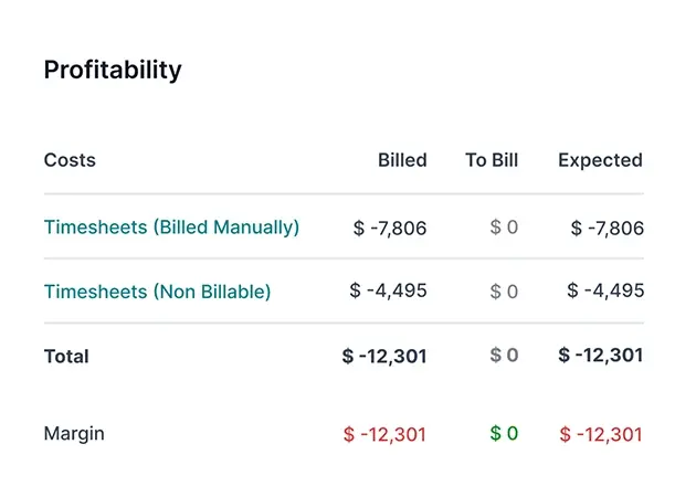 Integrate with budgets, timesheets, purchases, and sales.